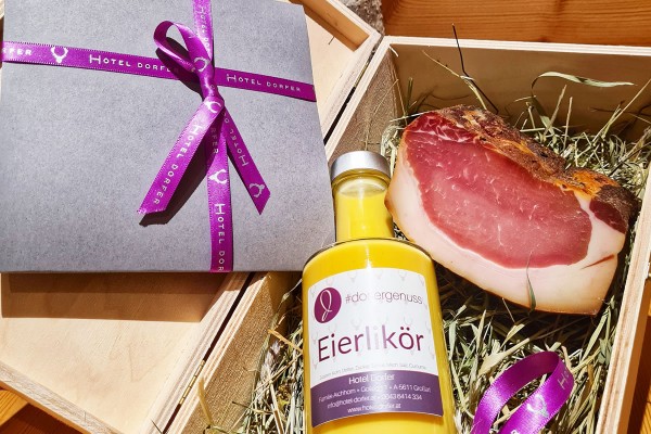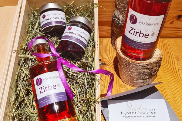 Sie suchen das passende Geschenk für Freunde oder Familie? Wie wäre es mit einem Urlaubsgutschein oder einem Kistal vom Hotel Dorfer in Großarl? Mit einem Gutschein für unser 3-Sterne Hotel überreichen Sie kostbare Augenblicke für familiäre, erlebnisreiche und genussvolle Ferien. Mit dem Genuss-Kistal, dem Likör-Kistal, Sprudel-Kistal oder Wunsch-Kistal holen Sie kulinarische Höhepunkte von uns zu sich nach Hause.